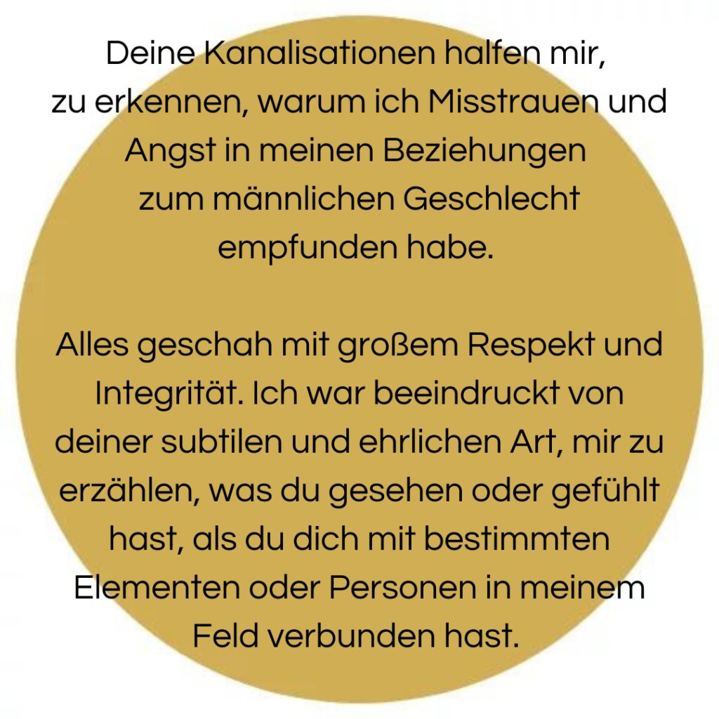 - Stellvertretend oder selbst erfahren: Nach Absprache trete ich stellvertretend in dein Feld und empfange Informationen für dich. Und/oder du betrittst selbst dein Feld und spürst in deinem eigenen Körper, was es zu erzählen hat.