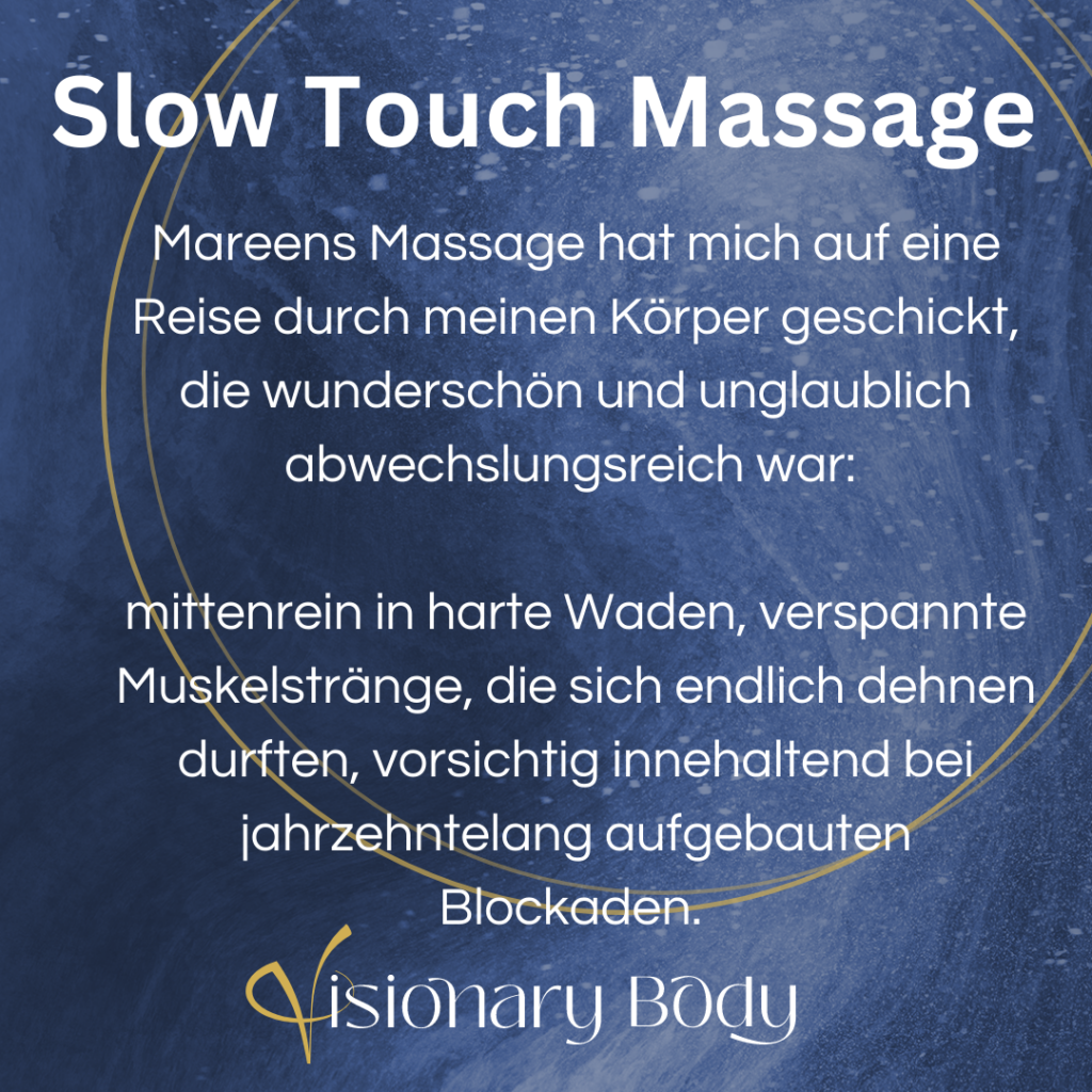 Bei der Slow Touch-Massage berühre ich deinen Körper langsam und achtsam. Sie schenkt Sicherheit und Geborgenheit. Du kannst dich mit der Zeit immer tiefer in die Berührung sinken lassen. Die Berührung ist ohne Ziel und Wollen und folgt der Intuition meiner Hände und der Sprache deines Körpers.