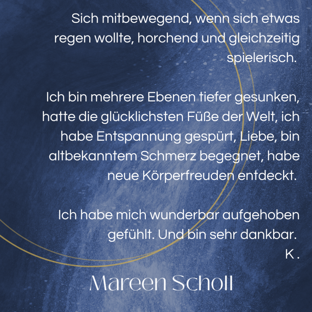 Die Qualität der Berührung spricht durch die Langsamkeit deinen sinnlichen und emotionalen Körper an. Das kann als sehr intim wahrgenommen werden. Ja, du und dein Körper sind gemeint. Auch Sinnlichkeit und Genuss sind eingeladen, vielleicht sogar Erregung. Der Gleichmut der Berührung kennt jedoch kein Ziel, nimmt das an, was entsteht. Vielleicht verweilen wir – haltend – und fließen weiter.